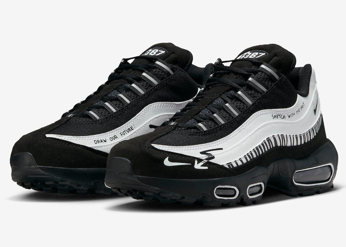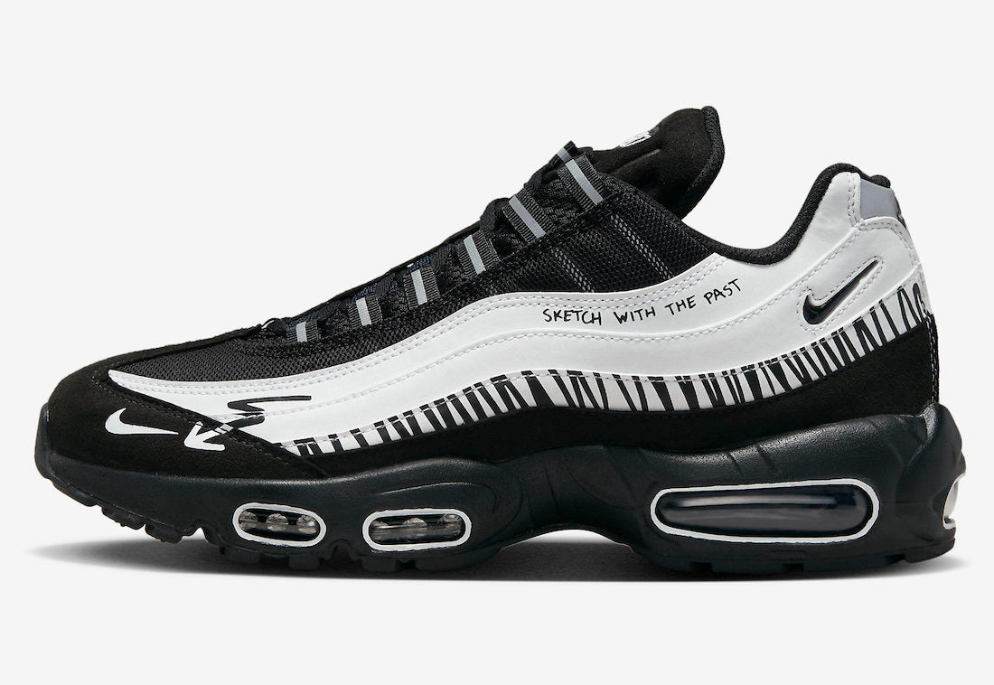 Want a blank slate? Go for the Air Max 95 Sketch With The Past! Packed with a marker, the piece invites you to bring out your creative side. This sneaker sees Air Max 95 muscle-inspired side panels void of design so you can feel free to do your own sketches and doodles. Meanwhile, the majority of the construction is dressed in black, from the nubuck toe and mesh upper to the plush tongue and mudguard. Quirky touches such as the zigzag and arrow graphics and the “SKETCH WITH THE PAST” round off the irreverent look. Underfoot, is the traditional black midsole with visible Air cushioning and a grippy outsole.